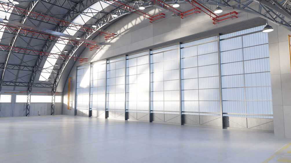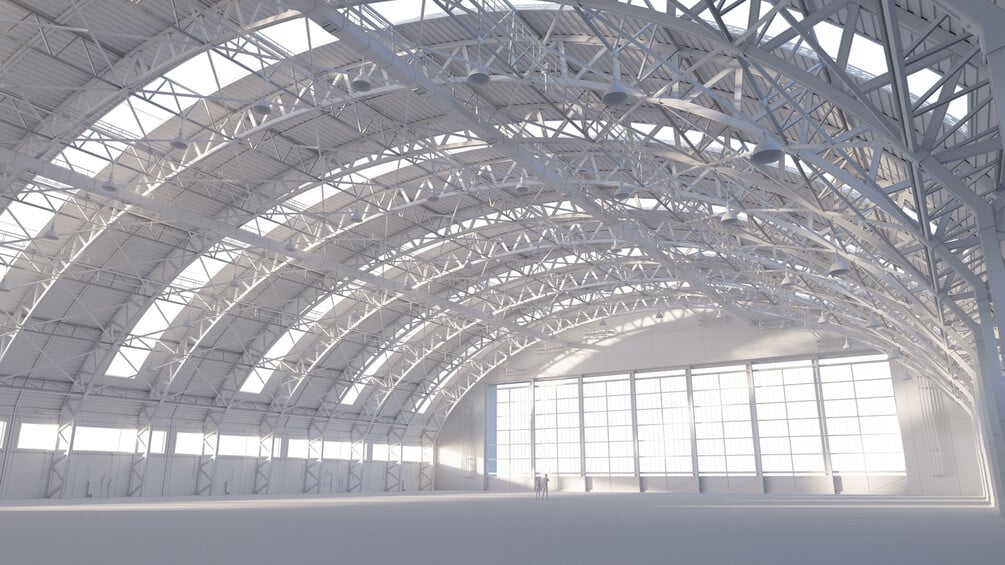 Aircraft Hangar (81x61x21 meters) with curved top framework. Can also be used as warehouse.